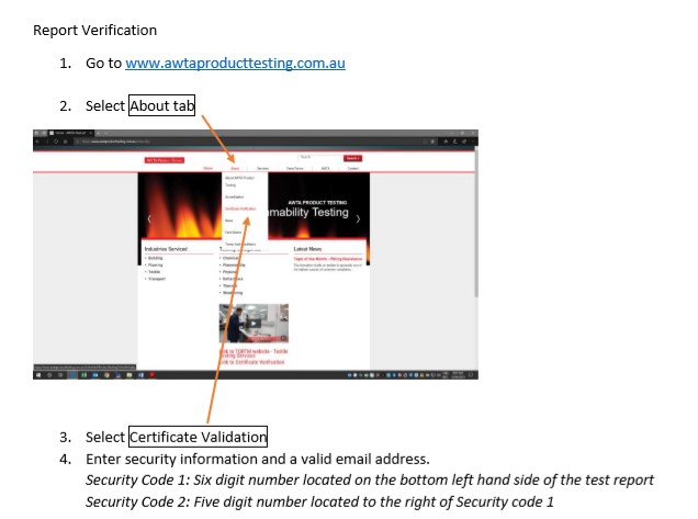 The link to the certificate verification service is located at www.awtaproducttesting.com.au (under the “ABOUT” tab)